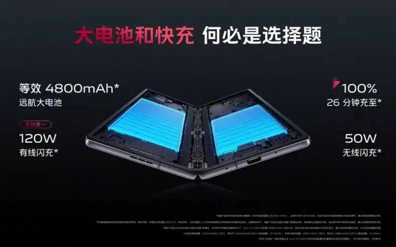 Vivo X Fold 2 is a smartphone that boasts a powerful battery system. It has a unique 120W dual-core flash charge, 50W wireless flash charge, and an equivalent 4800mAh long-lasting battery. With this system, it can be fully charged in just 26 minutes.