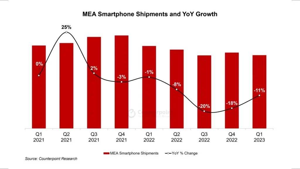 According to the latest Smartphone Shipment report released by the market research firm Counterpoint Research, the shipment volume of smartphones in the Middle East and Africa (MEA) region dropped by 11% year-on-year and 3% month-on-month. This marks the lowest quarterly shipment volume since 2016.