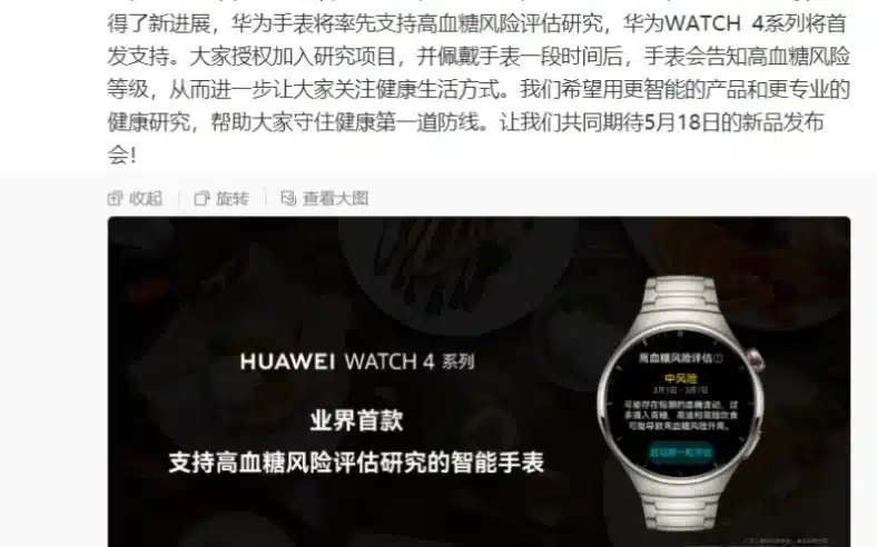 On May 15th, Gizcoupon reported that Huawei Yu Chengdong’s official Weibo account(Chinese Social Platform) announced that its smartwatch would be the first to support Hyperglycemia risk assessment research. The Huawei WATCH 4 series will be the first to support this feature. Users can opt to participate in the research project and wear the watch for a period of time. The watch will then inform them of their Hyperglycemia risk level, thereby encouraging them to pay further attention to their health and lifestyle. The Huawei WATCH 4 series will debut at Huawei’s new product launch on May 18th, Beijing time.