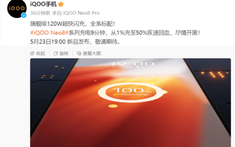 On May 19th, Gizcoupon reported that it had been announced that the iQOO Neo8 series would be released on May 23rd at 19:00 Beijing time. iQOO official Weibo (a Chinese social media platform) has started warming up the iQOO Neo8/Pro Series. The entire iQOO Neo8 lineup will come with a standard 120W flash charge, capable of charging from 1% to 50% in just 9 minutes. Additionally, it features an equivalent 5000mAh battery.