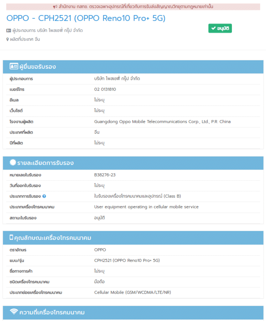 The NBTC has confirmed the upcoming release of the OPPO Reno 10 Pro+ global version (model CPH2521). The Reno 10 Pro (CPH2531) and Reno 10 (CPH2525) have already appeared on other certification platforms.