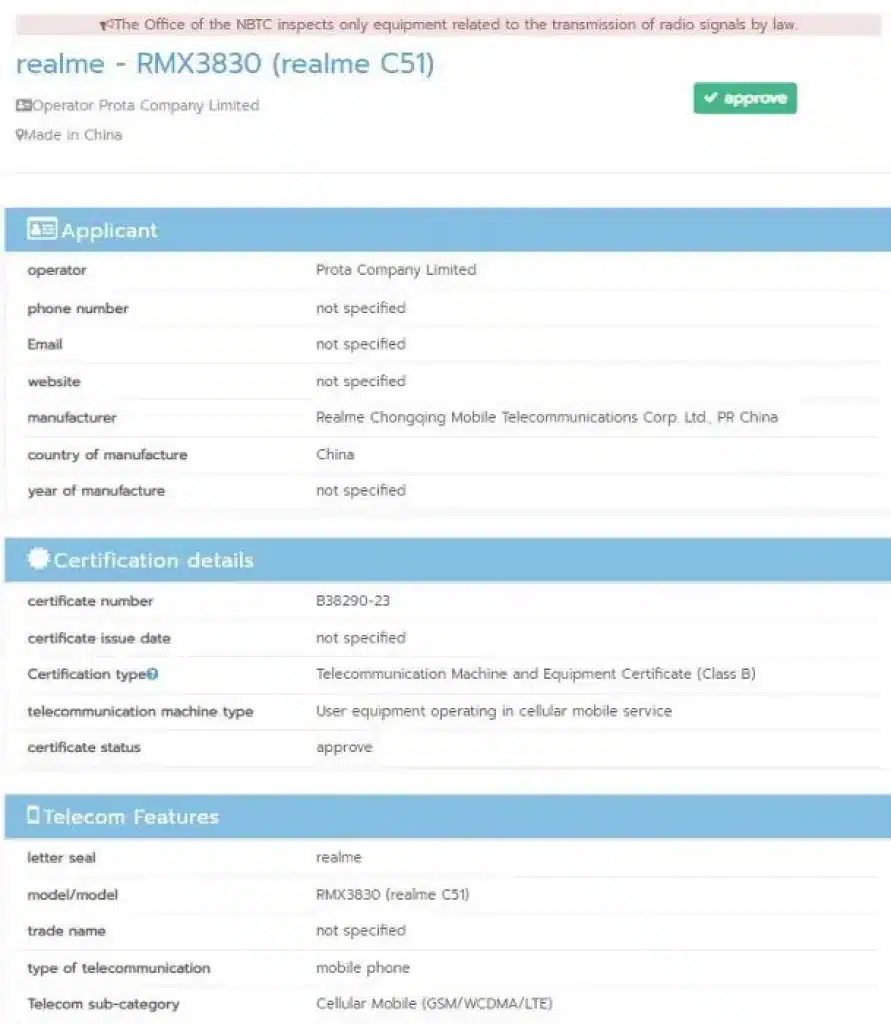 On June 8th, Gizcoupon reported that after the launch of the realme C53 in Malaysia on June 1st(Beijing Time), another phone called the realme C51 has now received certifications from NBTC (Thailand), BIS (India), and EEC (Europe). This suggests that the device may be released soon. Furthermore, the website of the Bureau of Indian Standards indicates that the phone will make its appearance in India shortly.