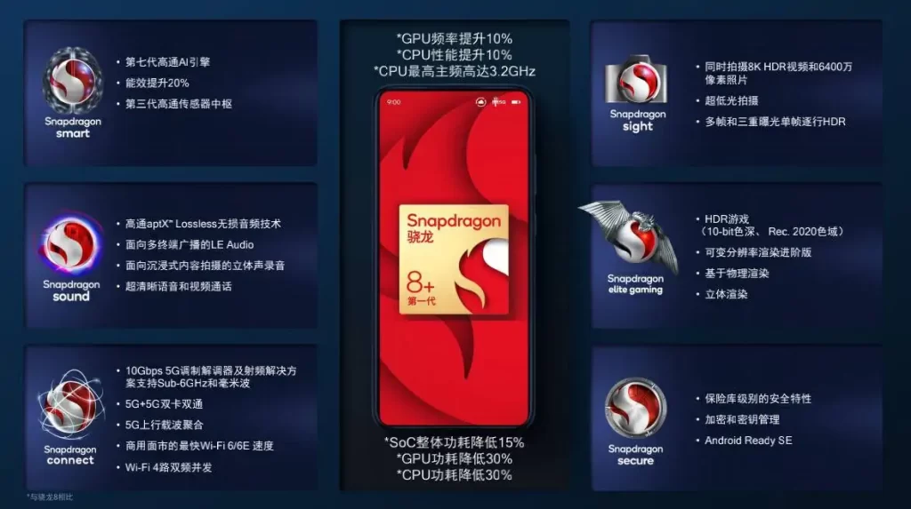 The OPPO Reno10 series consists of three models, each equipped with a different chipset platform. The OPPO Reno10 Pro+ features the top-of-the-line first-generation Snapdragon 8+ Mobile Platform. The CPU of the Snapdragon 8+ platform features a tri-cluster architecture with a large Cortex-X2 core, a large A710 core, and a small A510 core.