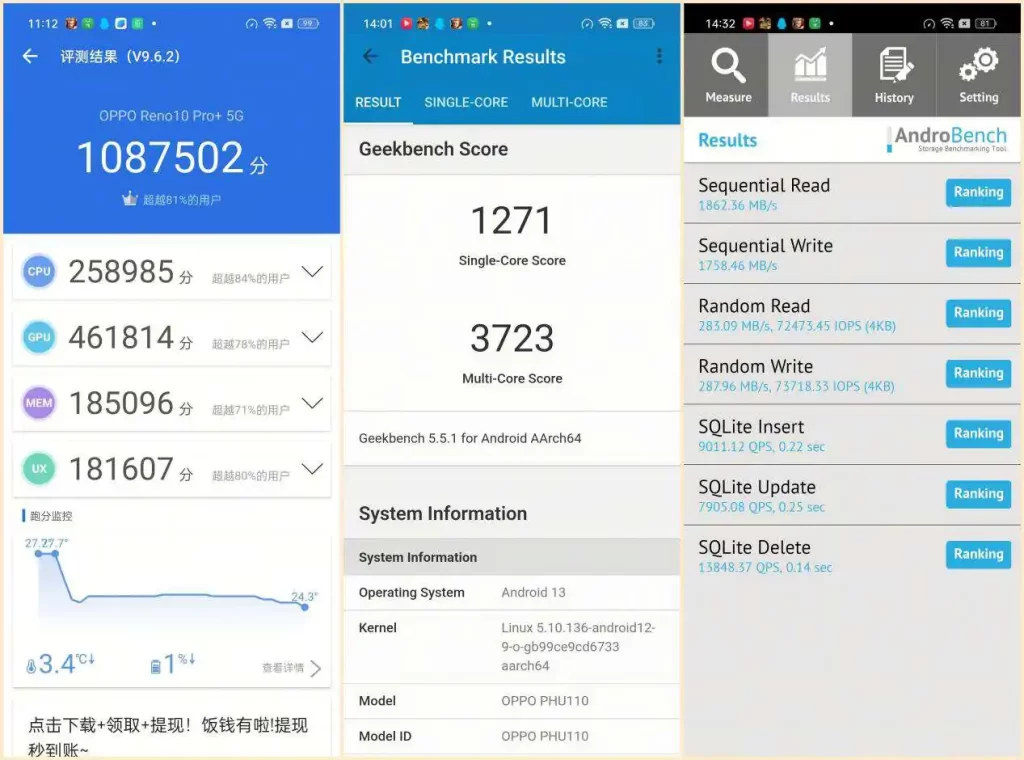 First, Gizcoupon conducted benchmark tests on the Reno10 Pro+. In terms of overall performance, it achieved a score of 1,087,502 on AnTuTu, which is an excellent result for the first-generation Snapdragon 8+ platform. Moving on to GeekBench 5, it scored 1,271 on the single-core test and 3,723 on the multi-core test. Lastly, on the AndroBench benchmark, the Reno10 Pro+ achieved a sequential read speed of 1,862.36MB/s, sequential write speed of 1,758.46MB/s, random read speed of 283.09MB/s, and random write speed of 287.96MB/s.