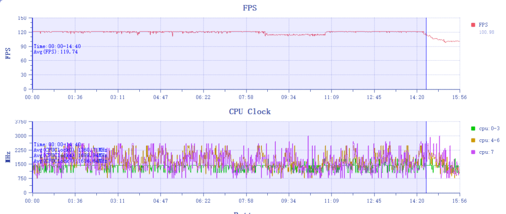 At the end of the game, the average frame rate achieved on the Reno10 Pro+ was 119.74 fps. Throughout the gameplay, there were no noticeable frame drops or stuttering. Additionally, the frame rate curve appeared relatively stable without significant fluctuations.