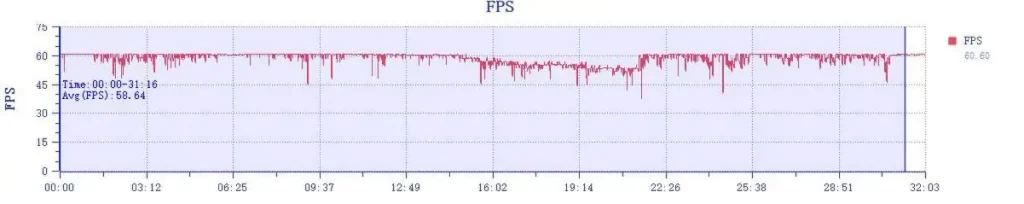 At the end of the game, the average frame rate achieved was 58.64 fps. During encounters with multiple enemies and elite monsters, some fluctuations in frame rate were observed. However, the impact on the gameplay experience was not significant, and overall, the game remained relatively smooth.
