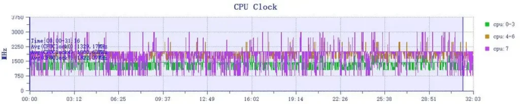 Analyzing the CPU frequency curve, during gameplay, the Cortex-X2 large core and A710 big core primarily operated at a stable frequency of around 2.0GHz. There were intermittent bursts to maximum frequency followed by quick drops. The A510 small core fluctuated between 1.1GHz and 1.5GHz. The small core, large core, and super large core work in coordination to ensure a smooth gameplay experience while controlling power consumption.