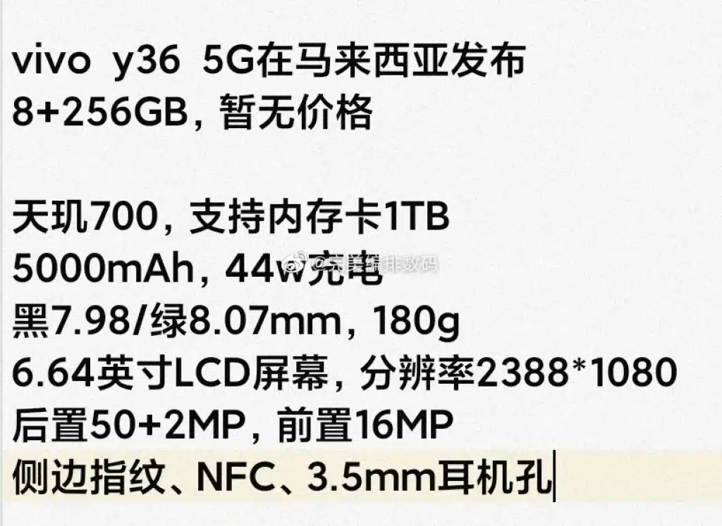 On June 12th, Gizcoupon reported that Vivo is set to launch the Vivo Y36 5G in Malaysia on June 13th (Beijing time). However, the pricing details have not been disclosed at the moment.