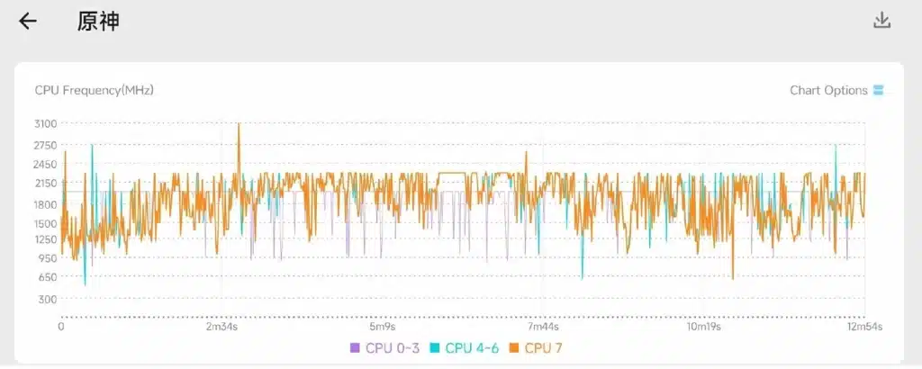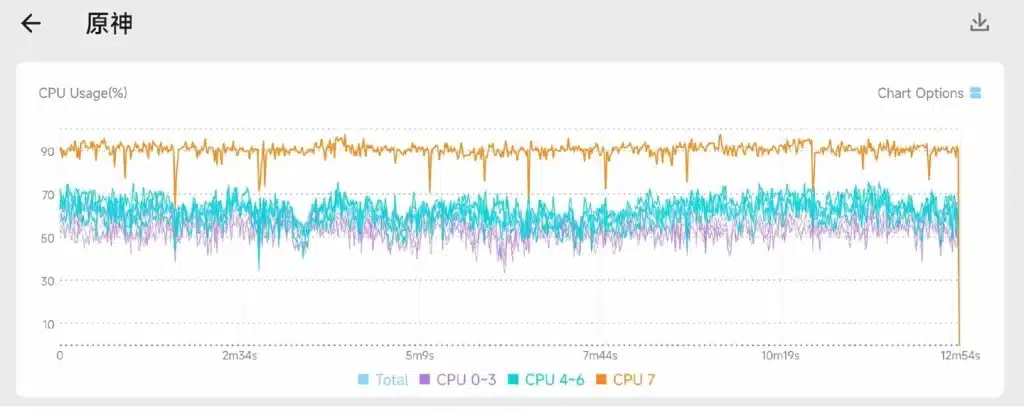 The core utilization graph shows that in the game “Genshin Impact,” the highest-performing core of the Dimensity 8200-Ultra, the 3.1 GHz Cortex-A78, was mostly utilized at around 90%.