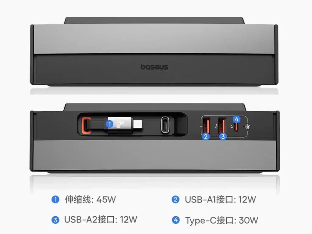 In terms of performance, the retractable cable supports a 45W PD output, the USB-C port supports fast charging with a power output of 30W, and the USB-A ports support a power output of 12W.