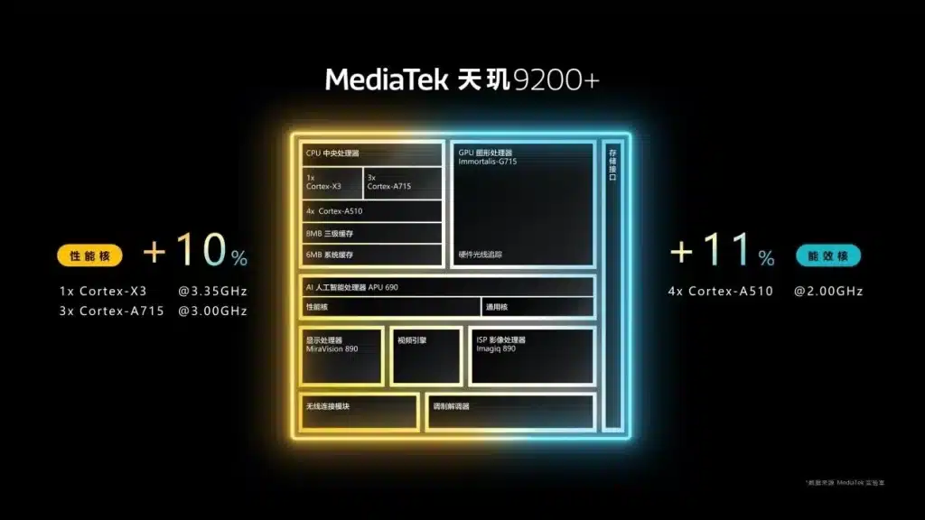 As an upgraded version of the Dimensity 9200, the Dimensity 9200+ offers a 10% performance improvement for the performance cores and an 11% improvement for the efficiency cores. Both the ultra-large core and big cores have been upgraded to over 3.0GHz. Therefore, its overall performance is not to be underestimated.