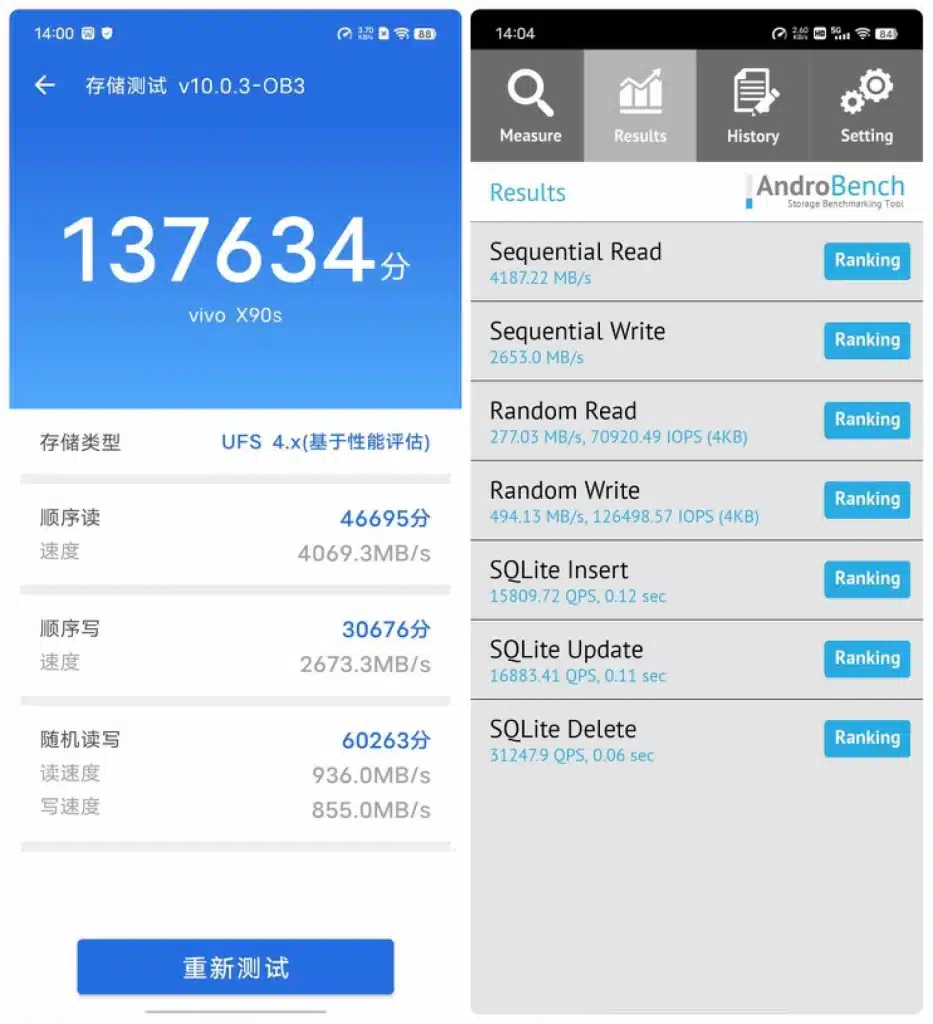 In terms of flash storage performance, the vivo X90s scored over 130,000 in the storage test of AnTuTu. The write speed exceeded 4,000MB/s, and the read speed reached over 2,600MB/s. This is still considered top-level performance in the Android camp, and there’s nothing much to elaborate on.