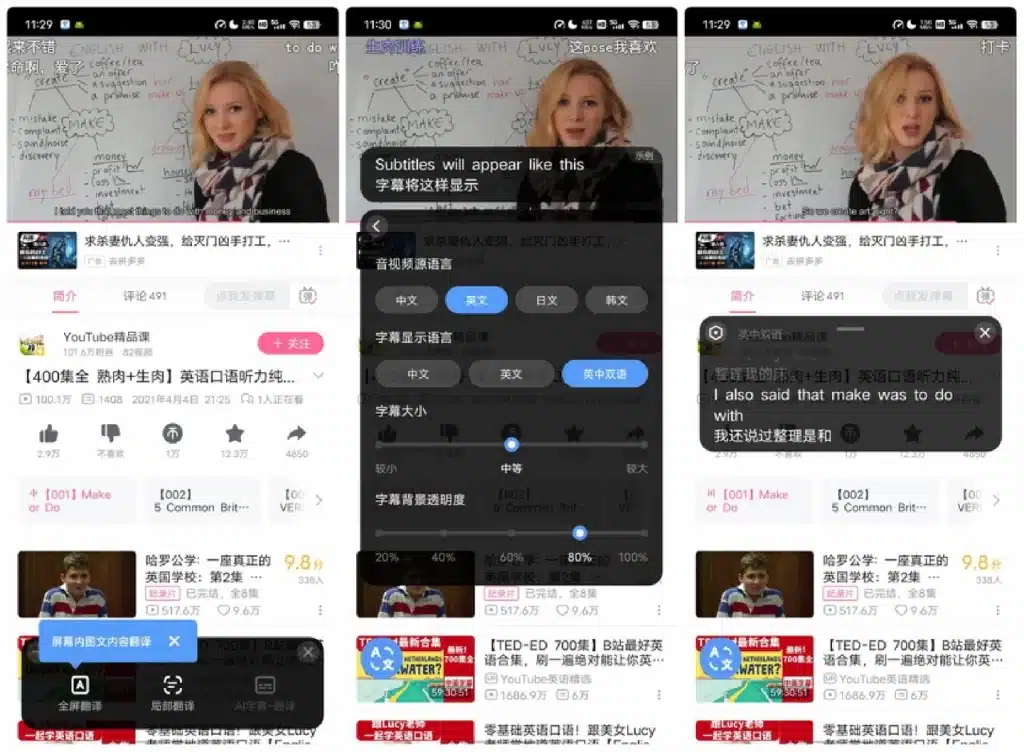 This feature supports partial translation, full-screen translation, and AI subtitle translation.