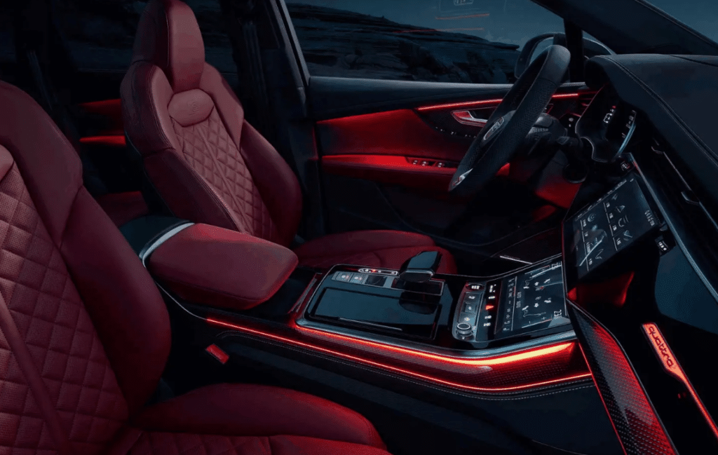 The Audi SQ7 Dark Knight Edition keeps the Q7’s layout but adds enhancements inside. To create a more refined interior, it includes features like carbon fiber interior strips, a perforated leather steering wheel, stainless steel pedals, and a carbon fiber gear lever. Moreover, standard sports seats with an RS-style design bring sophistication. For intelligent driving aids, the Dark Knight Edition features an ACC cruise system, intelligent parking assistance, and lane-keeping technology.