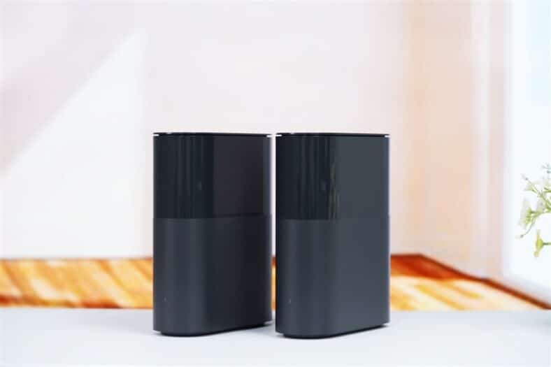 While identical in look and feel, both have different uses. The main router needs to be set up first; the sub-router automatically syncs in to create a MESH network. The main router supports the central gateway, while the sub-router does not; there are slight hardware differences between them. Both have rubber feet and heat dissipation holes with narrow top-side vents to avoid dust blocking the vents.