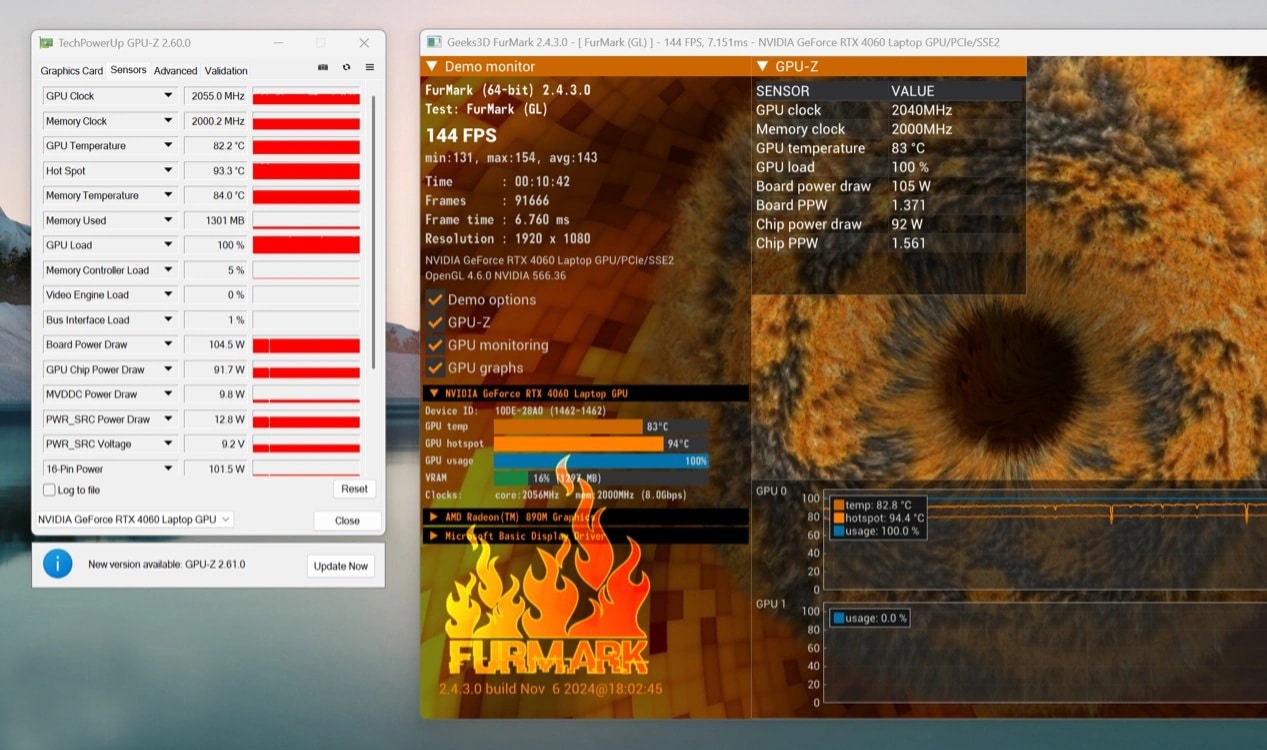 During CPU stress, the processor managed to hold 70W of power consumption with temperatures hovering at about 80°C, while the GPU worked its way to 105W and kept running smoothly at about 82°C. In the combined CPU and GPU stress test, the system balanced power consumption and heat dissipation effectively.