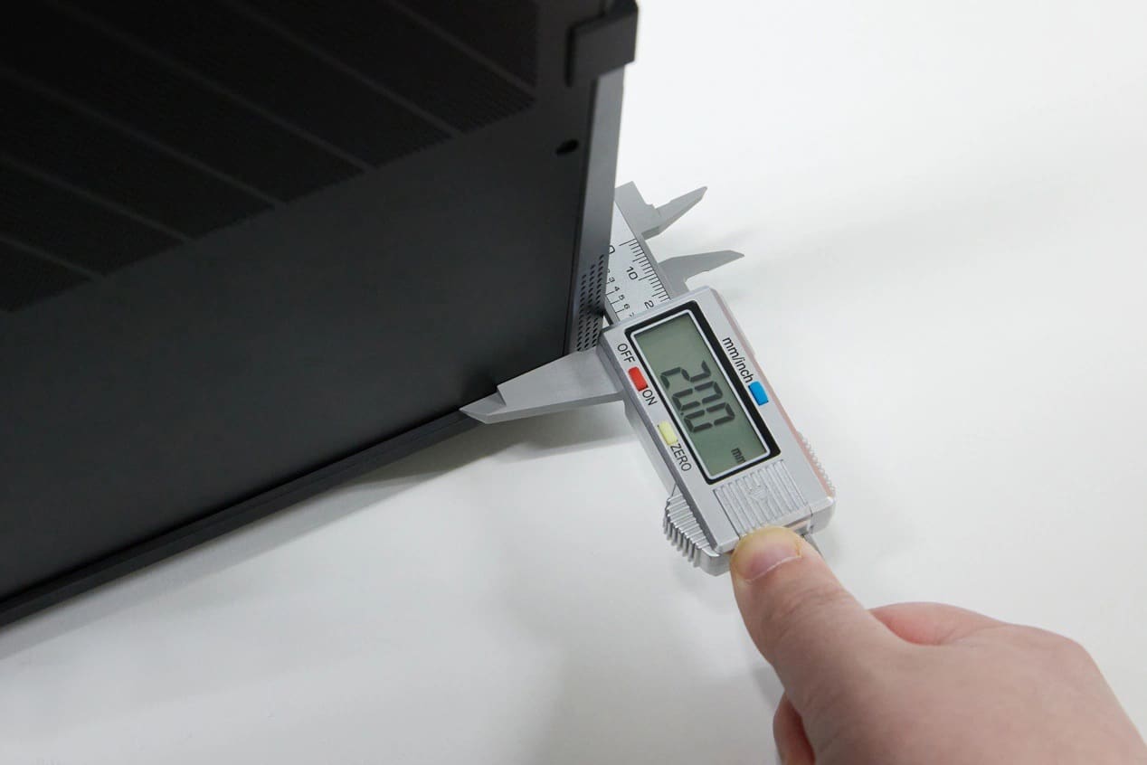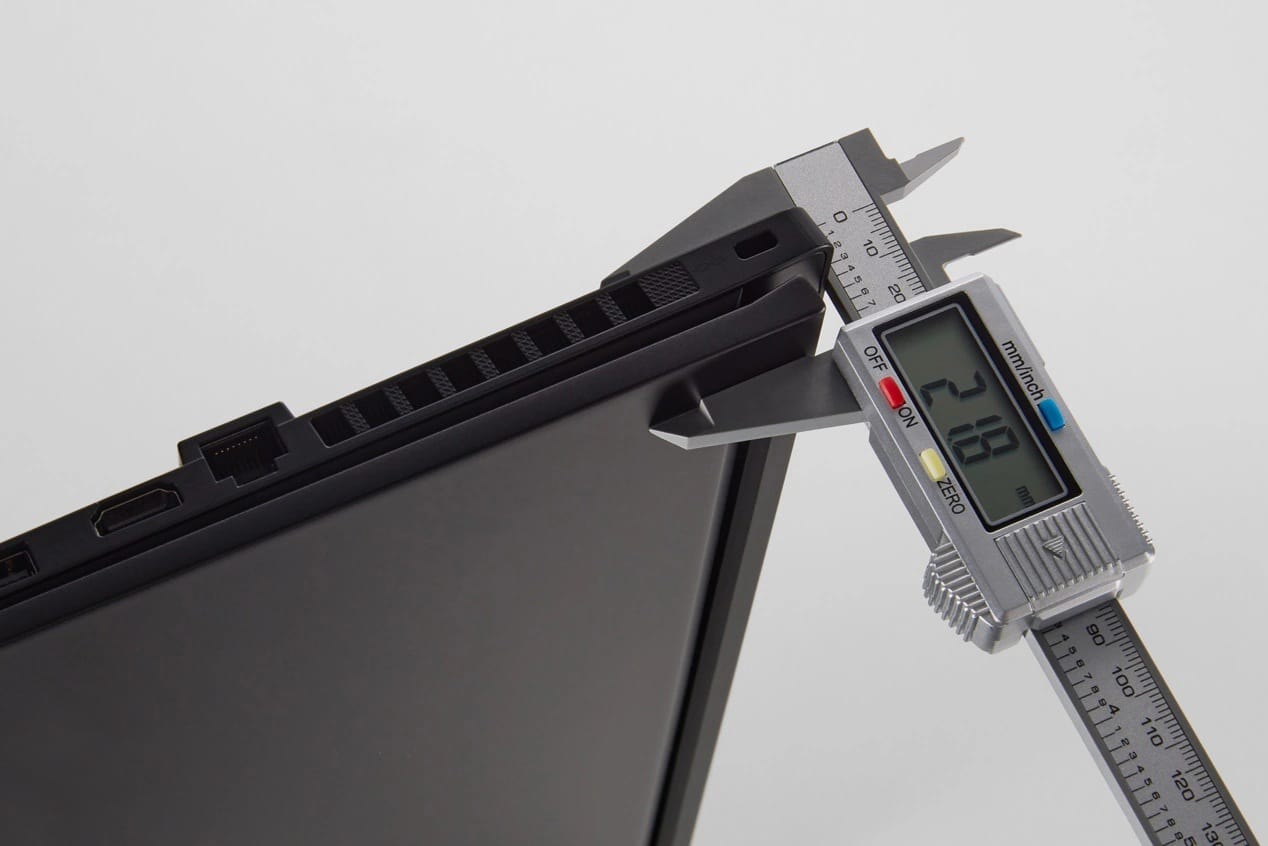 It measures 350 x 260 mm and is between 19.9 and 21.8 mm thick, making it compact. The official weight is given to be 2.1 kg, but on actual weighing, it was a bit less: 2.08 kg. Adding to the design element is the diagonal mirrored strip across the hinge with the bold STEALTH logo. The screen opens up to 180 degrees, offering flexible usage scenarios and increased convenience for content sharing.