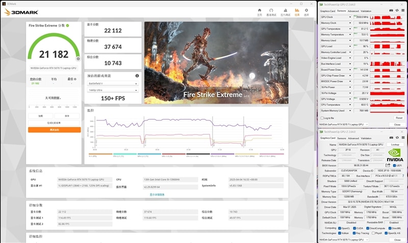In the 3DMark Fire Strike Extreme test at 2K resolution, the RTX 5070 Ti Laptop achieved a graphics score of 22,112 points. The top core temperature during testing was 81°C, the top core clock was 2550MHz, and the top power consumption was 141W.