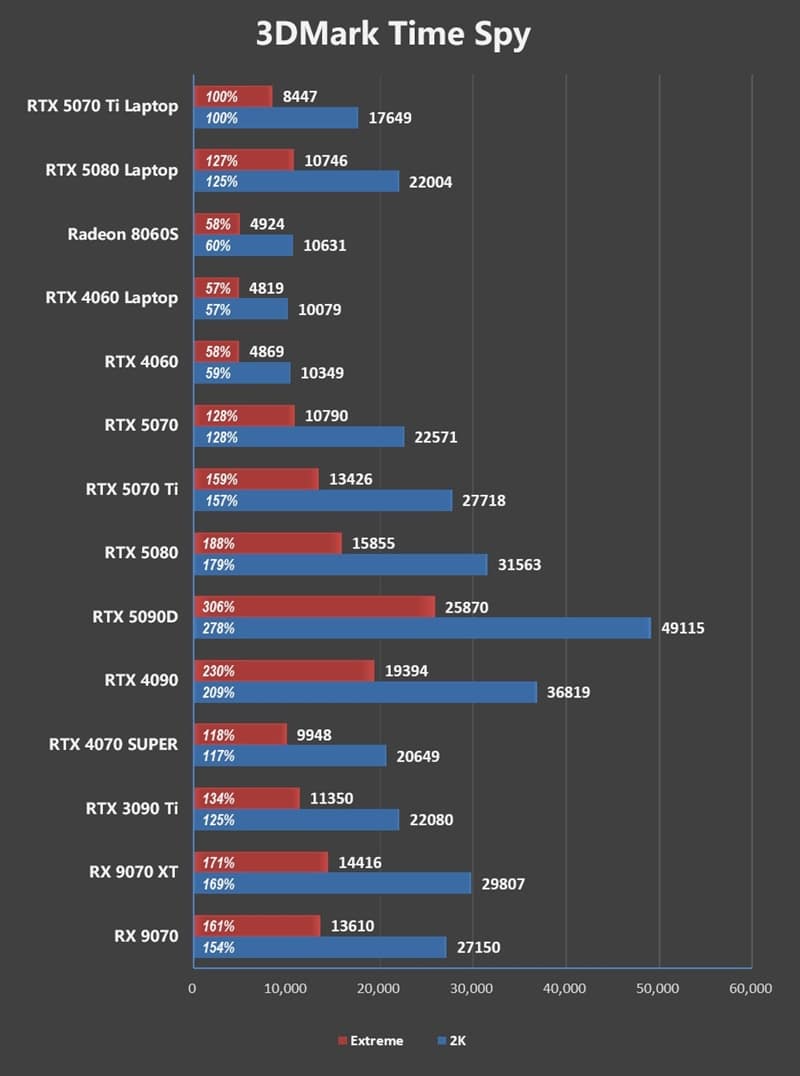 - Powered by the Ryzen 9 9800X3D, the RTX 4070 Super outperformed the RTX 5070 Ti Laptop by 28%.