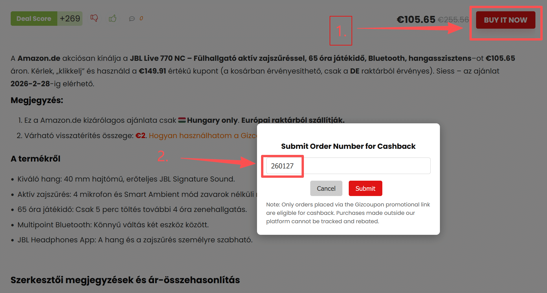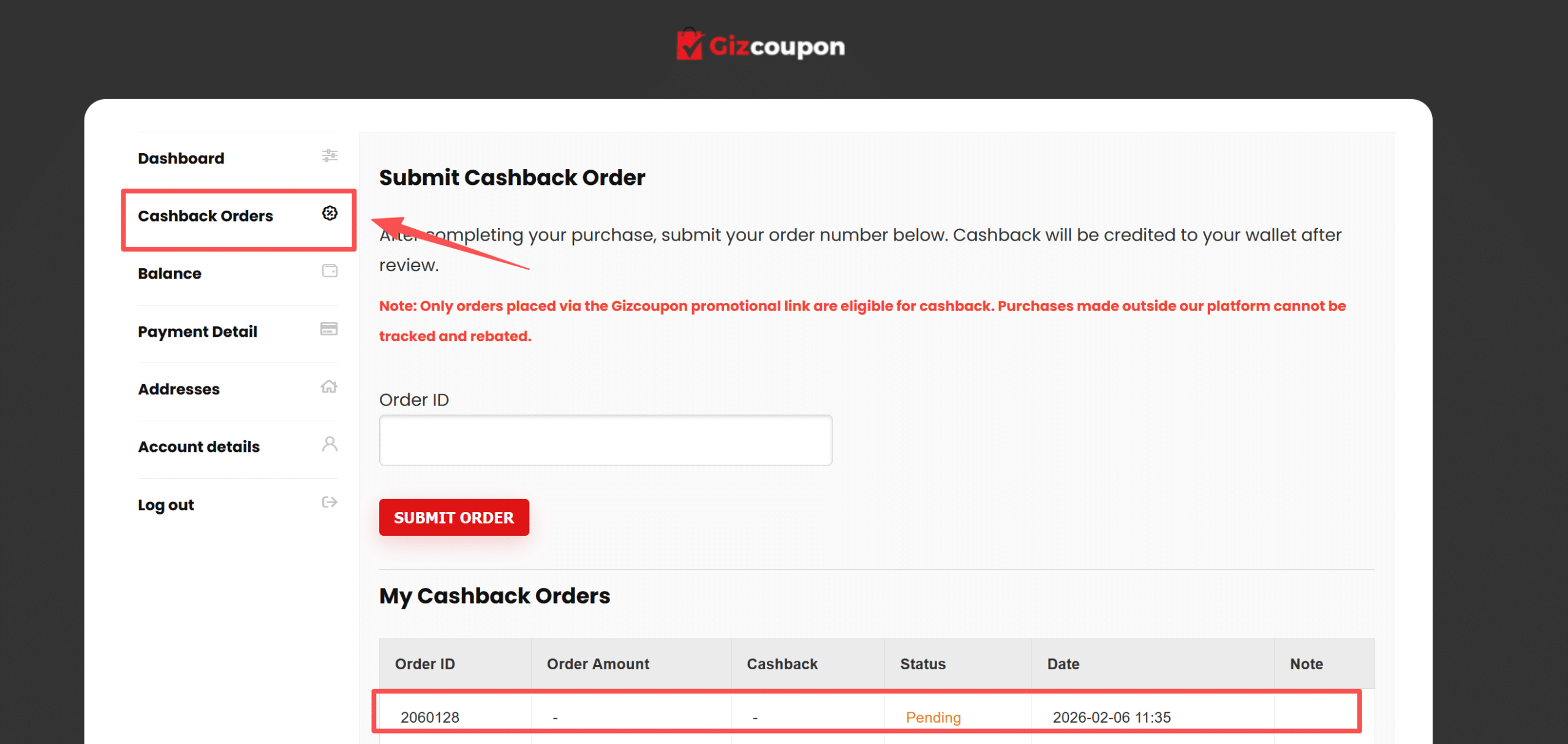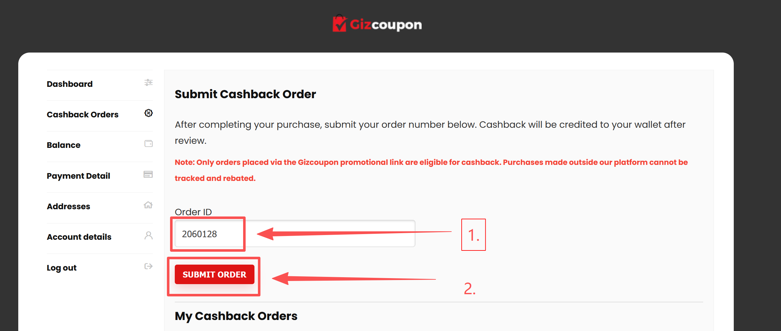 After ordering on Gizcoupon, there are 2 ways to submit the order Number for cashback.