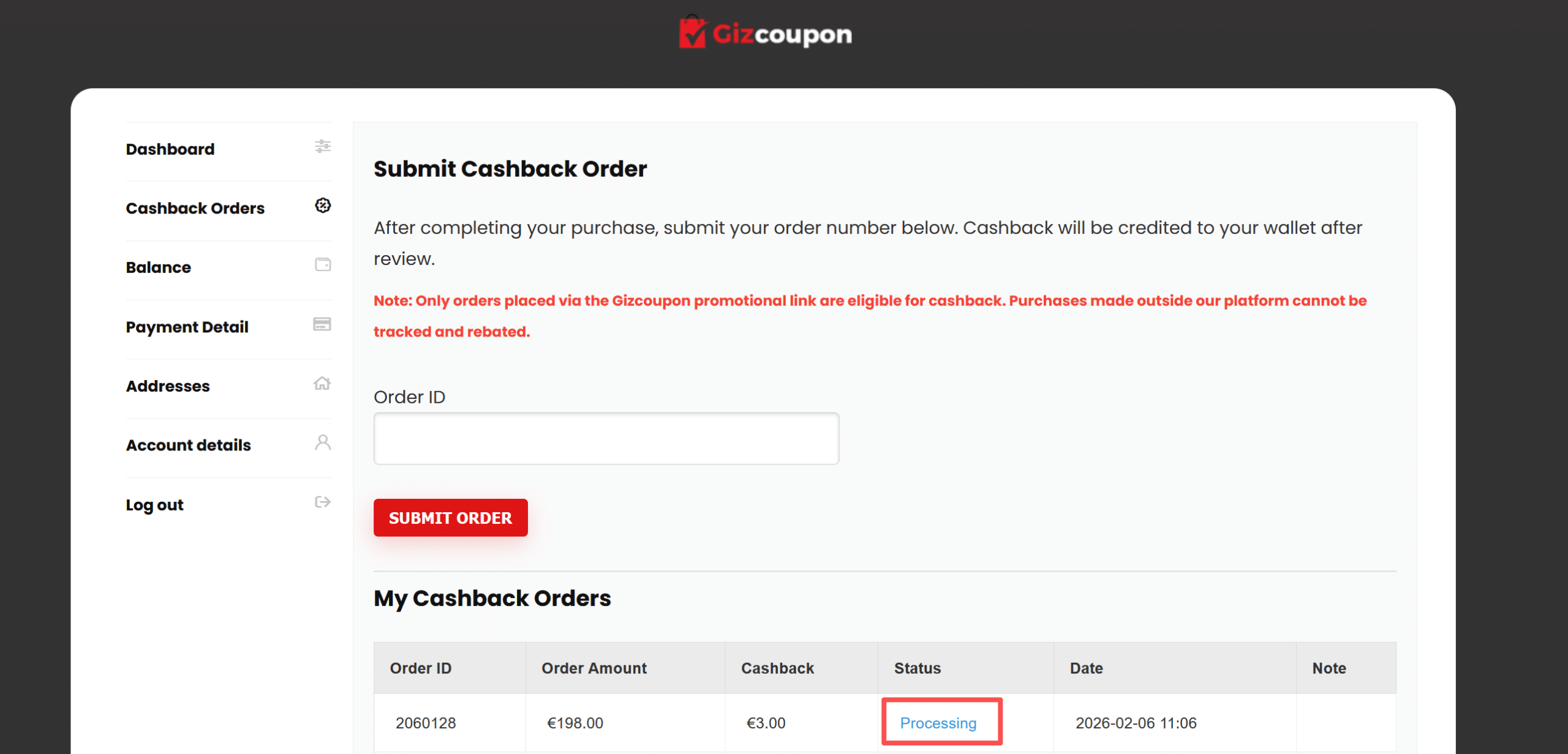 Once you submit your order, Gizcoupon will review the details and the amount. After this review, the status will change to Processing, and you will know the cashback amount.