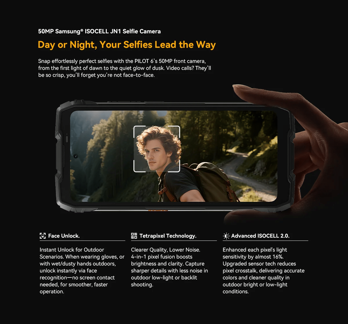 With a large 10,000mAh battery, Blackview OSCAL PILOT 6 provides days of standby time for worry-free use on multiple outdoor trips. 33W fast charging reduces charging time, keeping your device always ready for the next trip.