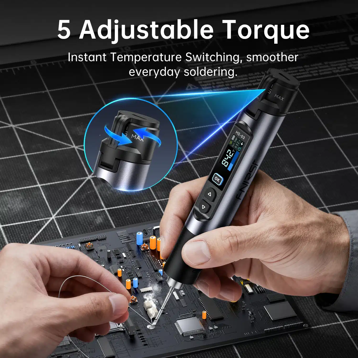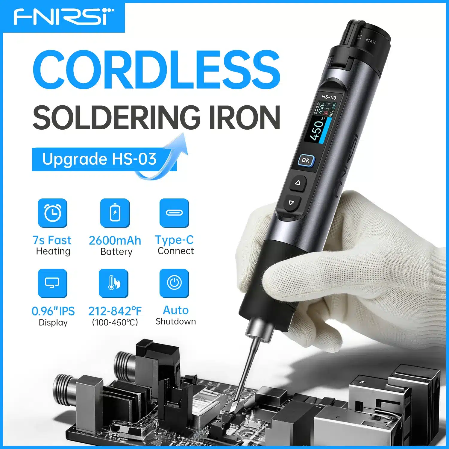 The FNIRSI HS-03 is a highly portable cordless soldering iron designed for on-the-go repairs and detailed electronic work. Powered by a standard 18650 battery and rechargeable via USB-C, it offers unparalleled flexibility without being tethered to an outlet. This compact soldering kit is an essential tool for hobbyists, technicians, and DIY enthusiasts seeking convenience and performance.
