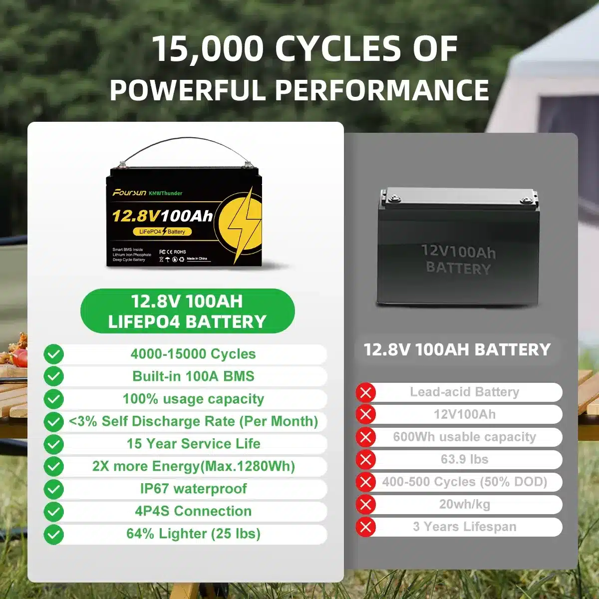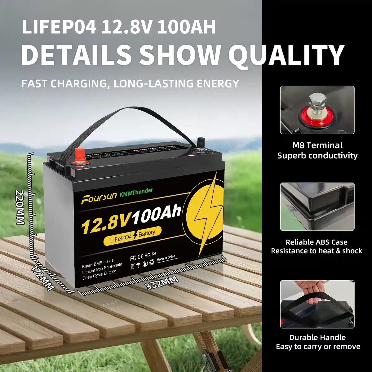 Foursun 12V LiFePO4 Battery 100Ah is a lightweight, long-life lithium battery with full discharge capability and advanced safety protection.