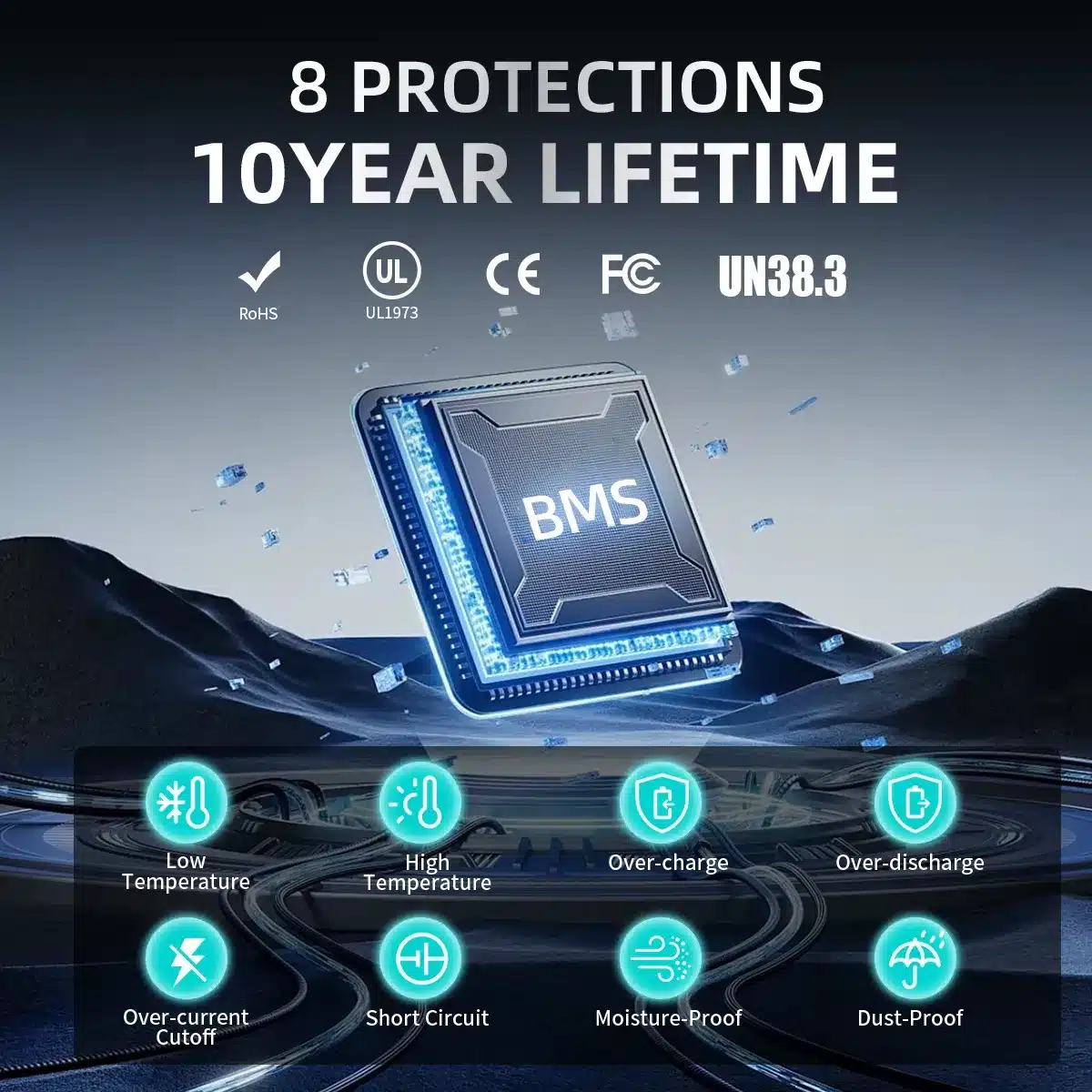Foursun 12V LiFePO4 Battery integrates a built-in 100A smart BMS. The BMS manages cell balancing to maintain consistent internal voltage. And it provides over-voltage, under-voltage, short-circuit, and temperature protection. Thus, it enhances operational safety and extends battery lifespan.