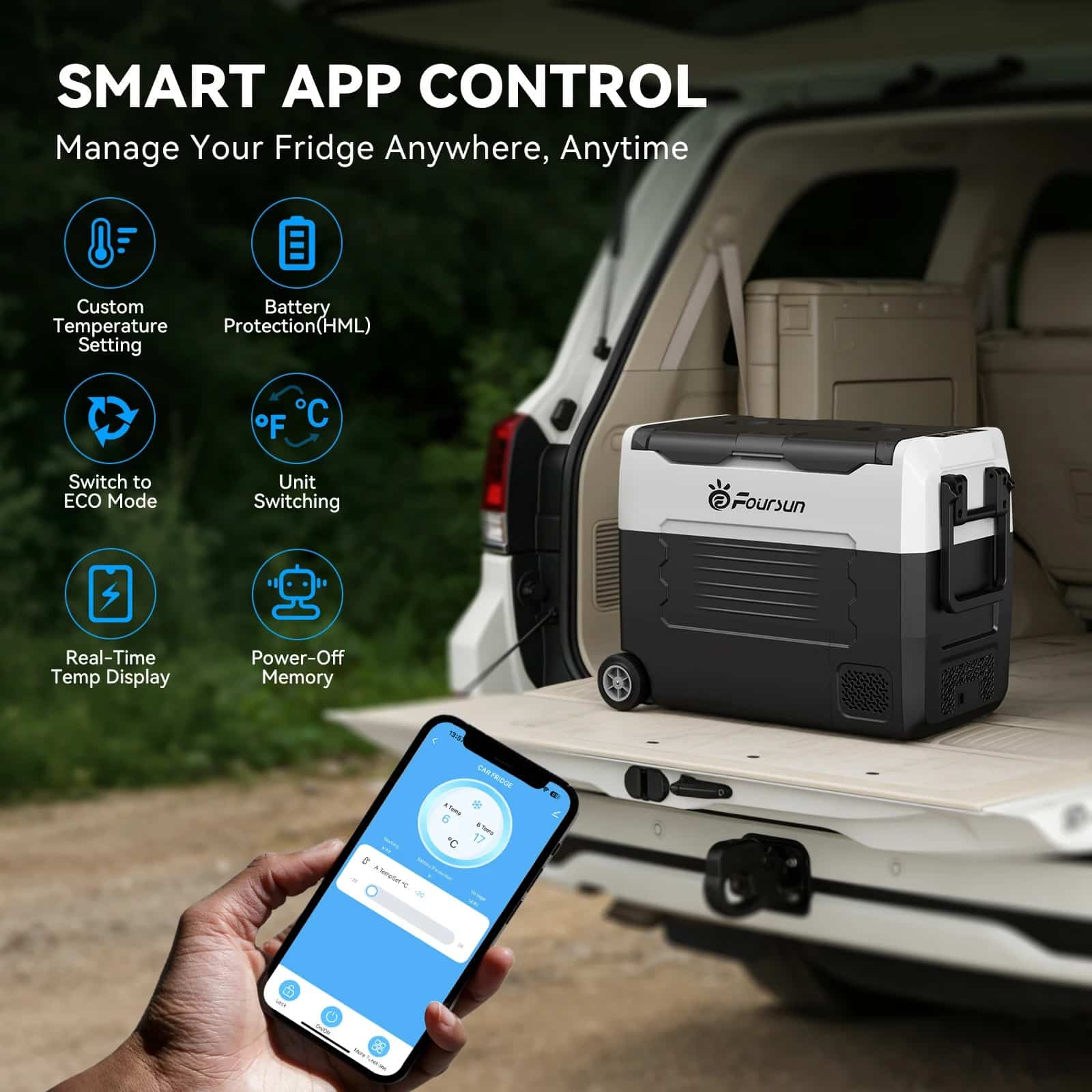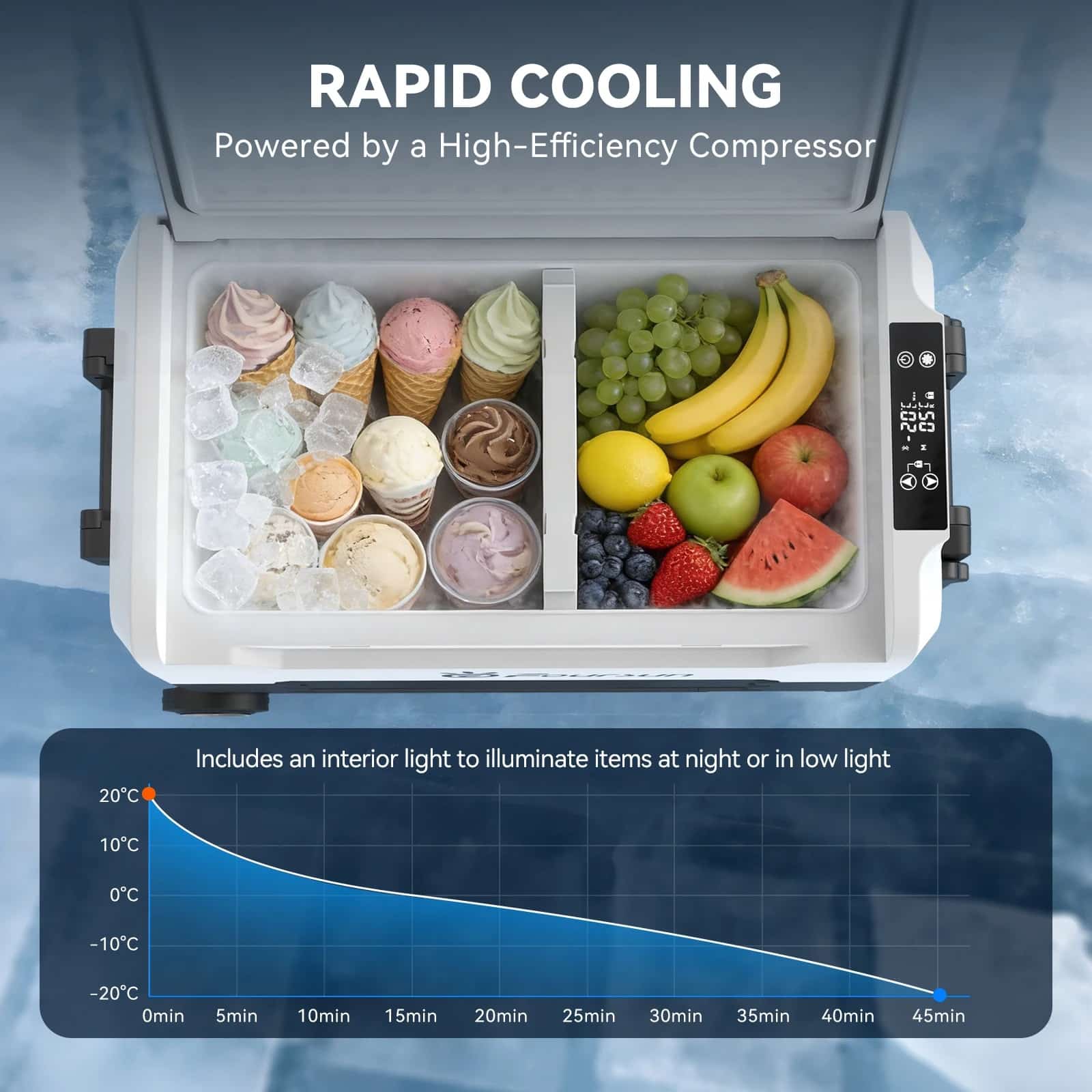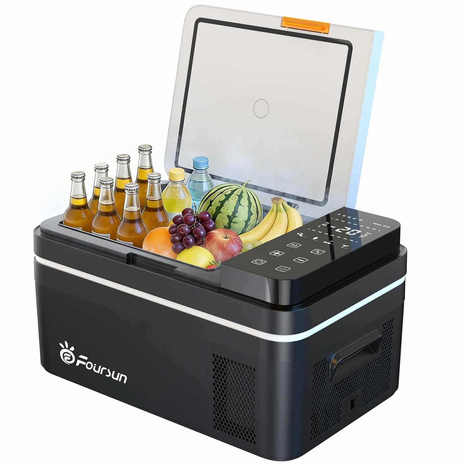 A high-efficiency compressor provides temperatures between -20 °C and +20 °C for perfect cooling. Foursun car refrigerator allows you to enjoy chilled food or cold drinks even in hot weather.