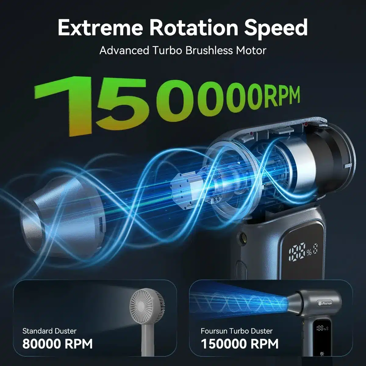 Incorporating a sophisticated brushless motor, Foursun TF100 Turbo Fan achieves a rotational speed of 150,000 RPM. This high-velocity internal unit delivers triple the output of standard handheld dusters, so you can handle demanding tasks with ease and quickly clear away stubborn buildup.