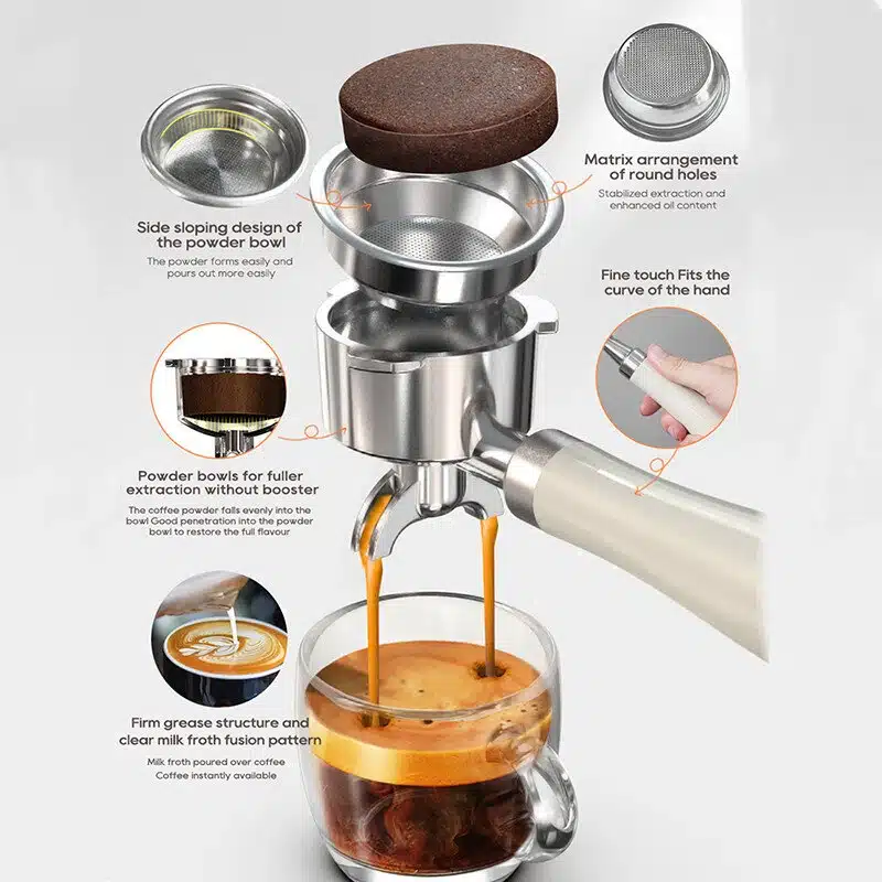 The H10B features a durable 51mm aluminum handle for quick heat transfer and enhanced safety. A spacious 1.3-liter removable water tank simplifies refilling and cleaning, making daily maintenance effortless. Additionally, an integrated cup warming function pre-heats mugs, preserving the coffee’s optimal temperature, aroma, and flavor for a consistently enjoyable experience.