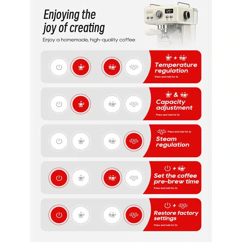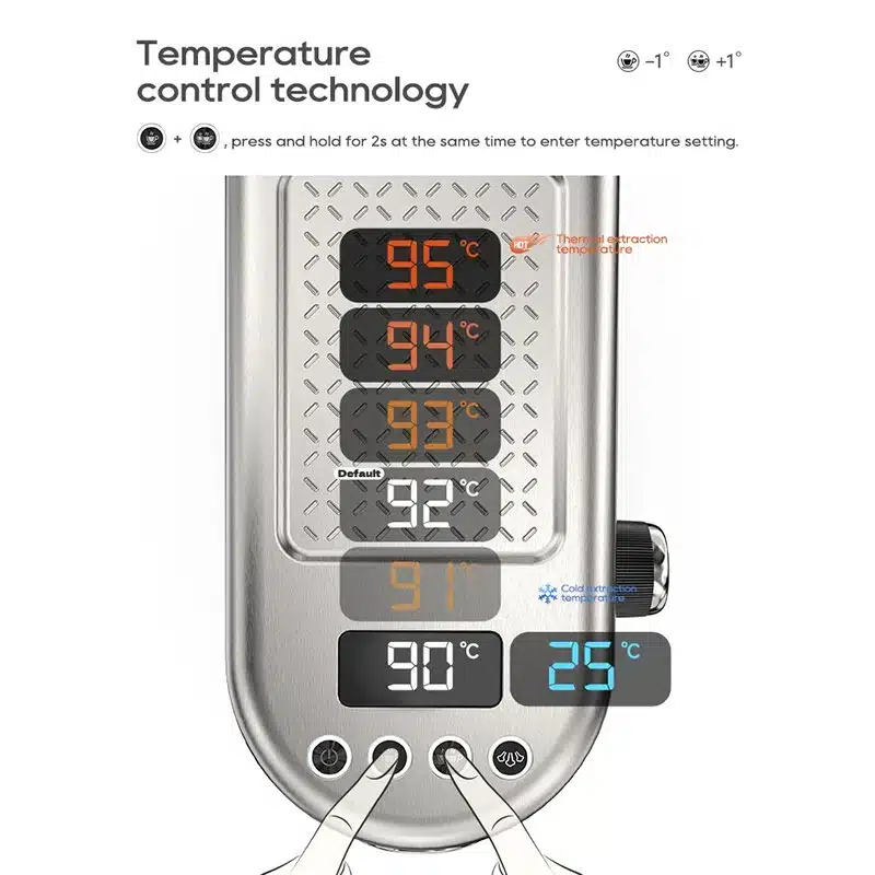 Experience unparalleled control over your coffee with programmable functions including adjustable coffee volume, extraction temperature, and pre-soak time. Users can fine-tune settings such as 35-300ml cup sizes, hot extraction at 90-95°C, cold at 25°C, and steam at 125-150°C. These features allow for precise adjustment of acidity, bitterness, and overall coffee strength to match various bean profiles and personal preferences.