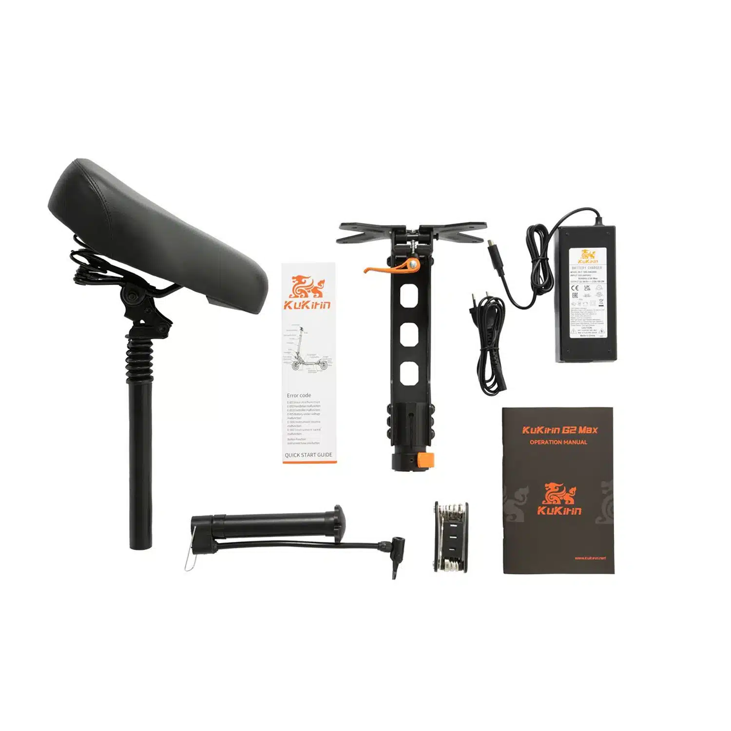 The package includes one KuKirin G2 MAX electric scooter with a seat, one instruction manual, and one charger. The scooter is ready to use out of the box, with a charging time of 10-11 hours for a full battery.