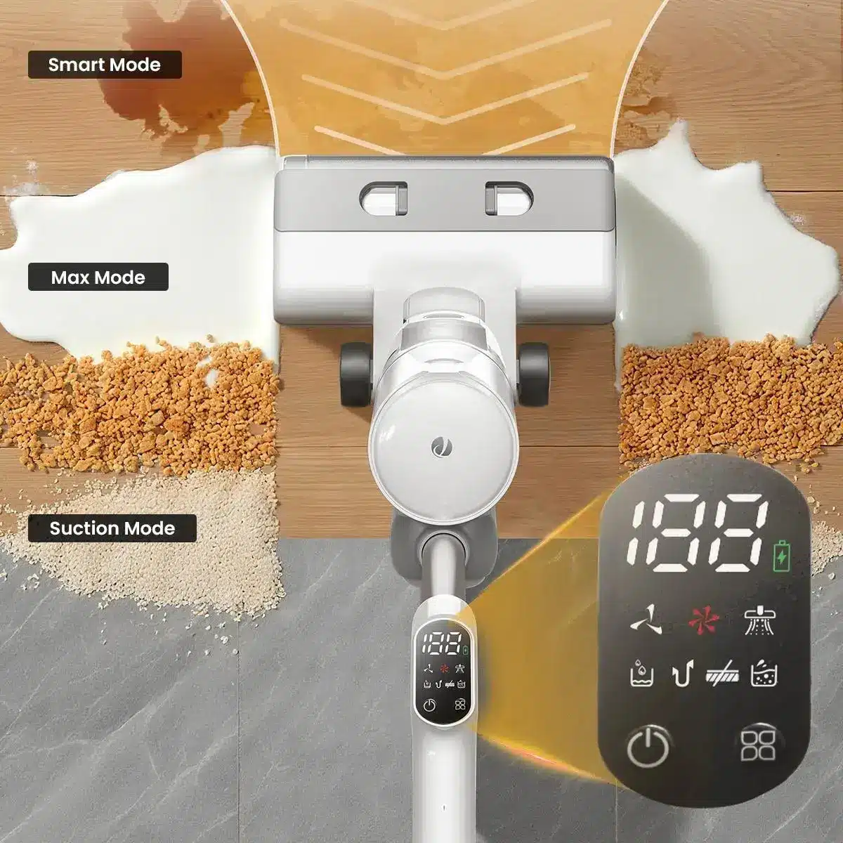 Integrated infrared sensors detect floor grime. It supports 3 modes: Smart Mode for automatically adjusting suction and water flow,  Vac Mode for water-saving cleaning, which is ideal for wooden floors, and the Max Mode for removing stubborn stains.