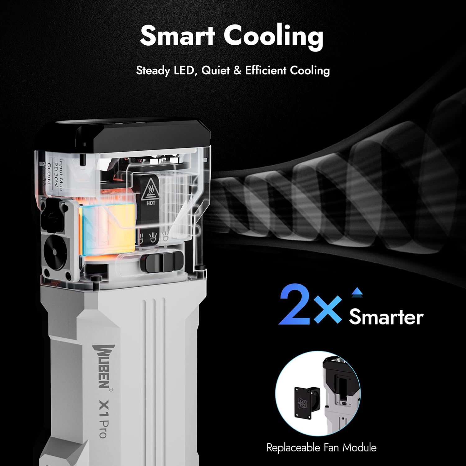 Operation is straightforward thanks to an ergonomic slide switch. It enables smooth, one-handed mode transitions. Double-click to instantly access Turbo mode (12,300 lumens). Triple-click to activate Strobe mode at any time. The X1Pro features an active cooling system with a removable fan. It manages heat automatically or manually. This ensures stable performance during extended use.