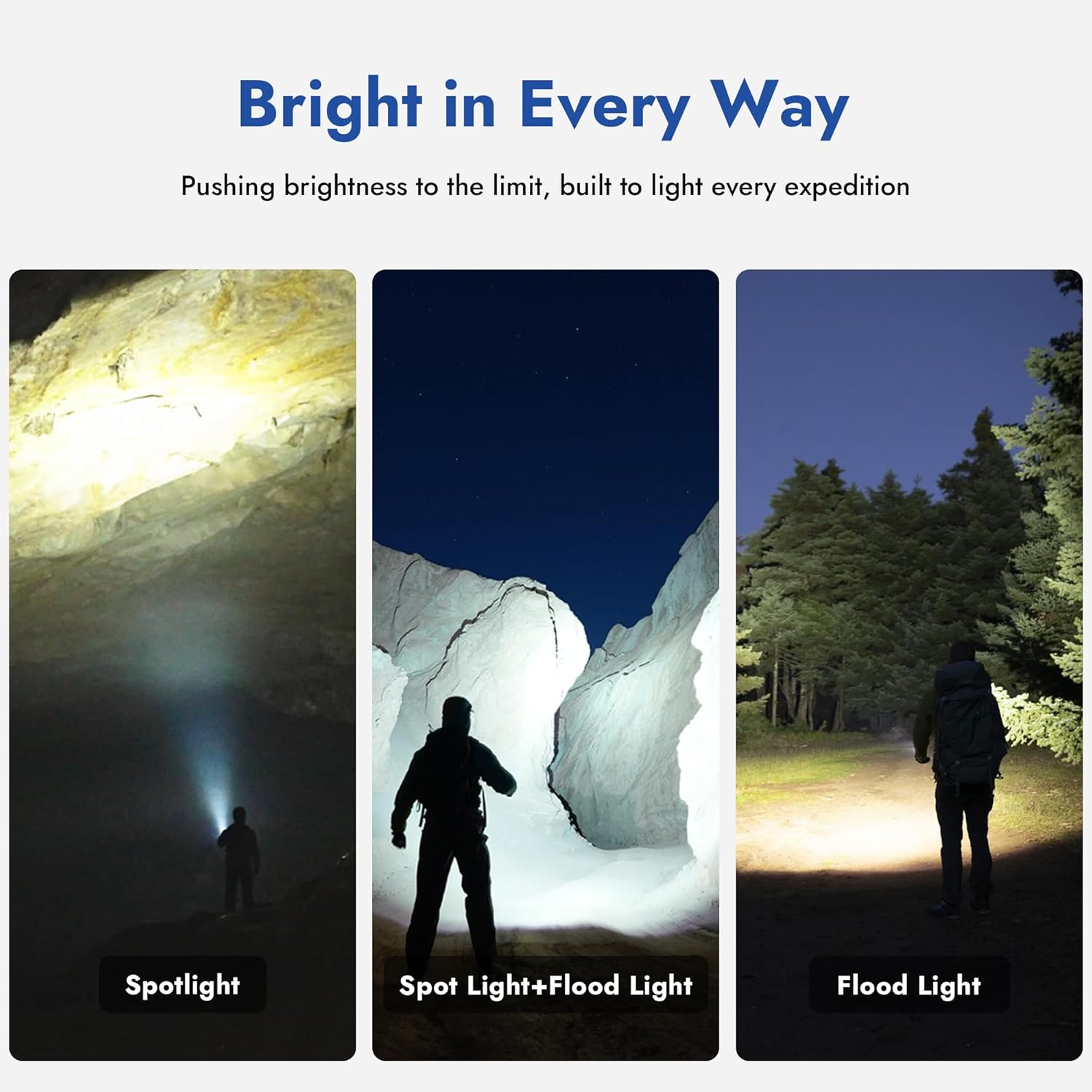• Dual modes – 8,650 lm flood + 3,650 lm spot. 5 levels (12,300–20 lm).