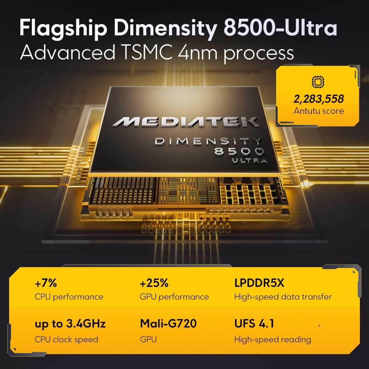 • Chip – Dimensity 8500-Ultra (4nm, 3.4GHz), Mali-G720 MC8.